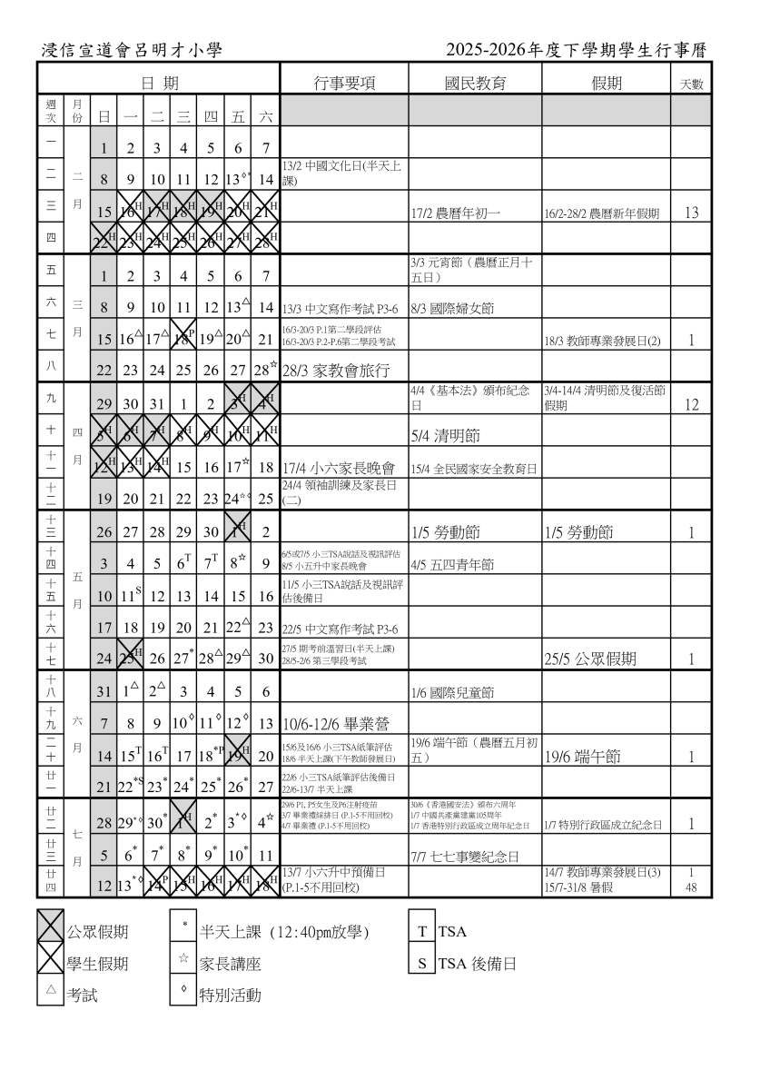 2025-26 年度下學期校曆表